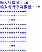 n = int(input("输入行数量:")) m = int(input("输入每行字符数量:")) # 计算行和列的中间位置 mid_row = n // 2 mid_col = m // 2 for i in range(n): # 判断当前行是否为中间行(或中间两行) if _____________________________________: print('*' * m) else: # 根据列数奇偶性构建行字符串 if m % 2 == 1: # 奇数列:左侧- + 中间* + 右侧- left = '-' * mid_col center = '*' right = '-' * mid_col print(left + center + right) else: # 偶数列:左侧- + 中间** + 右侧- left = '-' * (mid_col - 1) center = '**' right = '-' * (mid_col - 1) print(left + center + right)